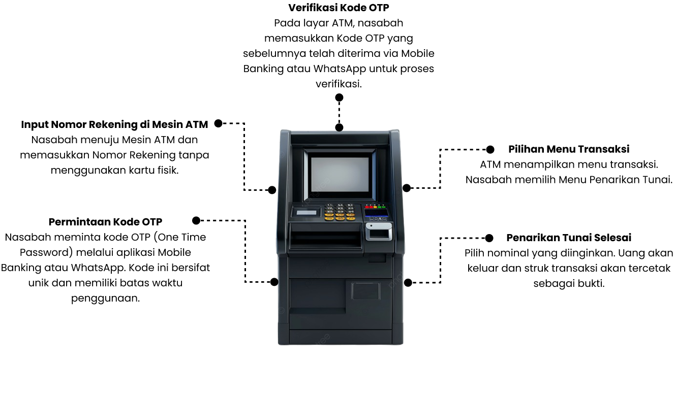 USSI ATM Cardless adalah layanan ATM tanpa kartu memadukan mesin ATM dengan kecanggihan teknologi Mobile Banking/WhatsApp/SMS untuk pengiriman OTP sebagai pengganti kartunya dan bersifat On-Us.
